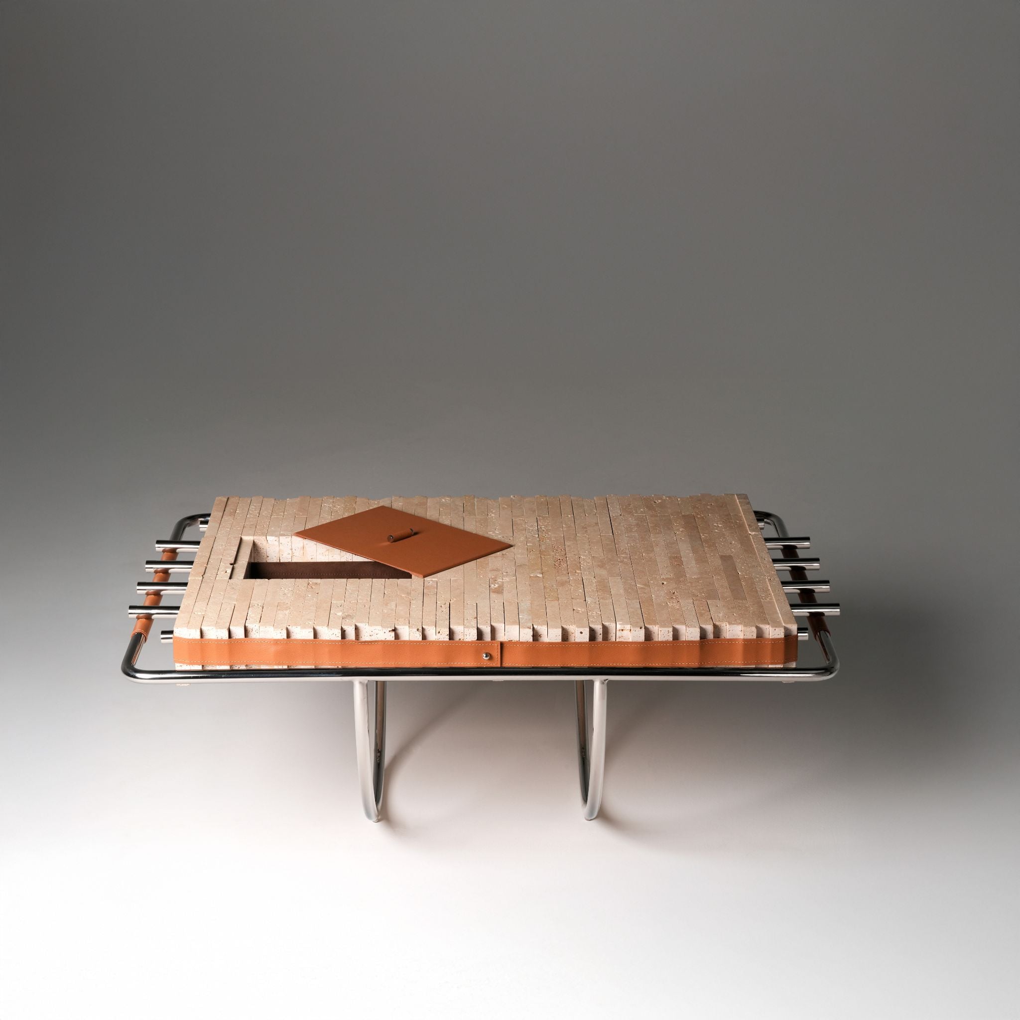 Upcycled materials: travertine, stainless steel, camel leather.