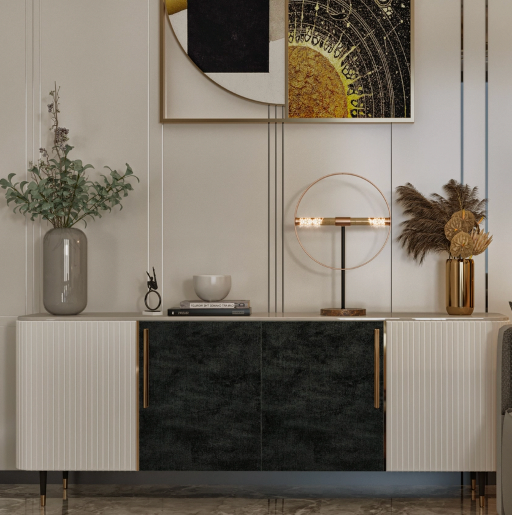 Stone, sand, brushed copper/stainless steel/brass.